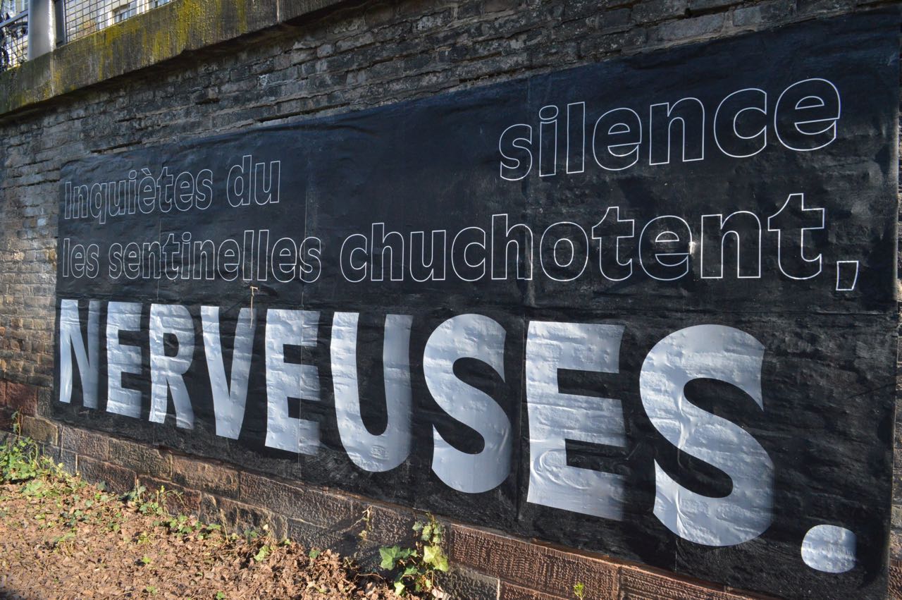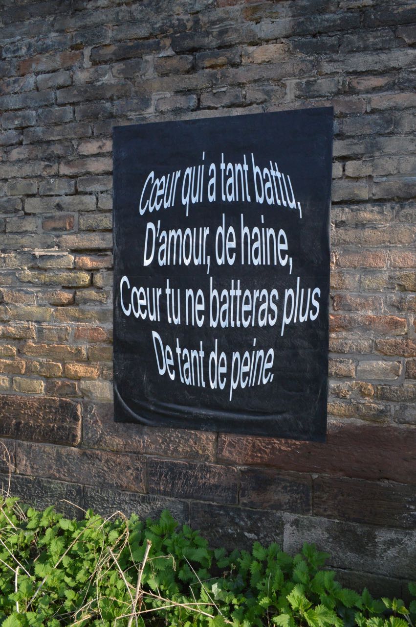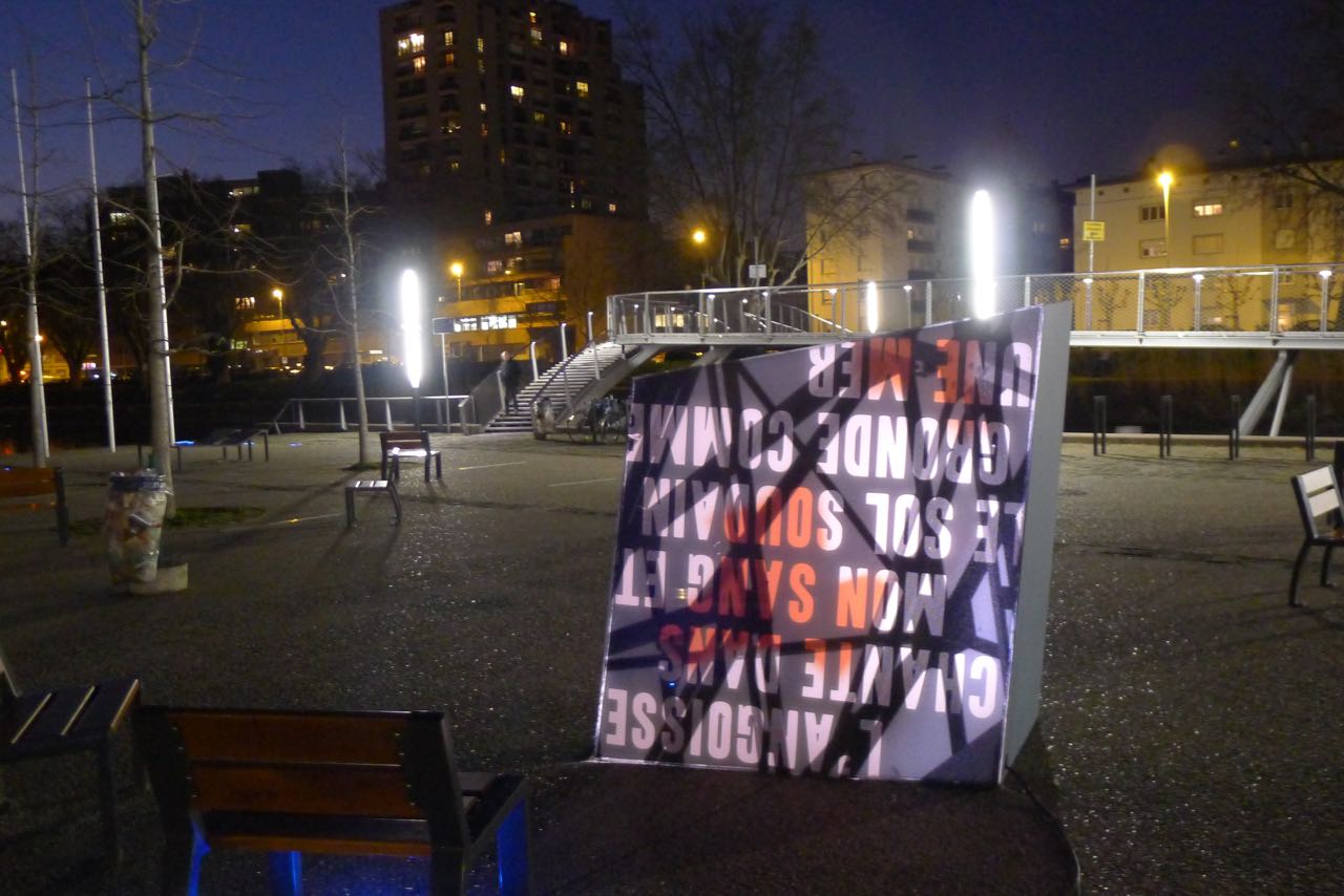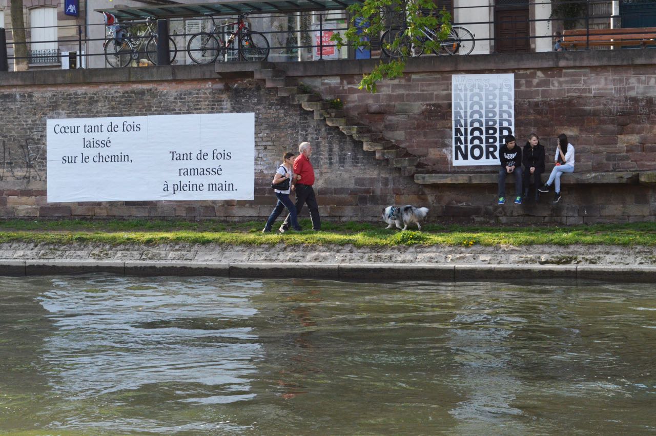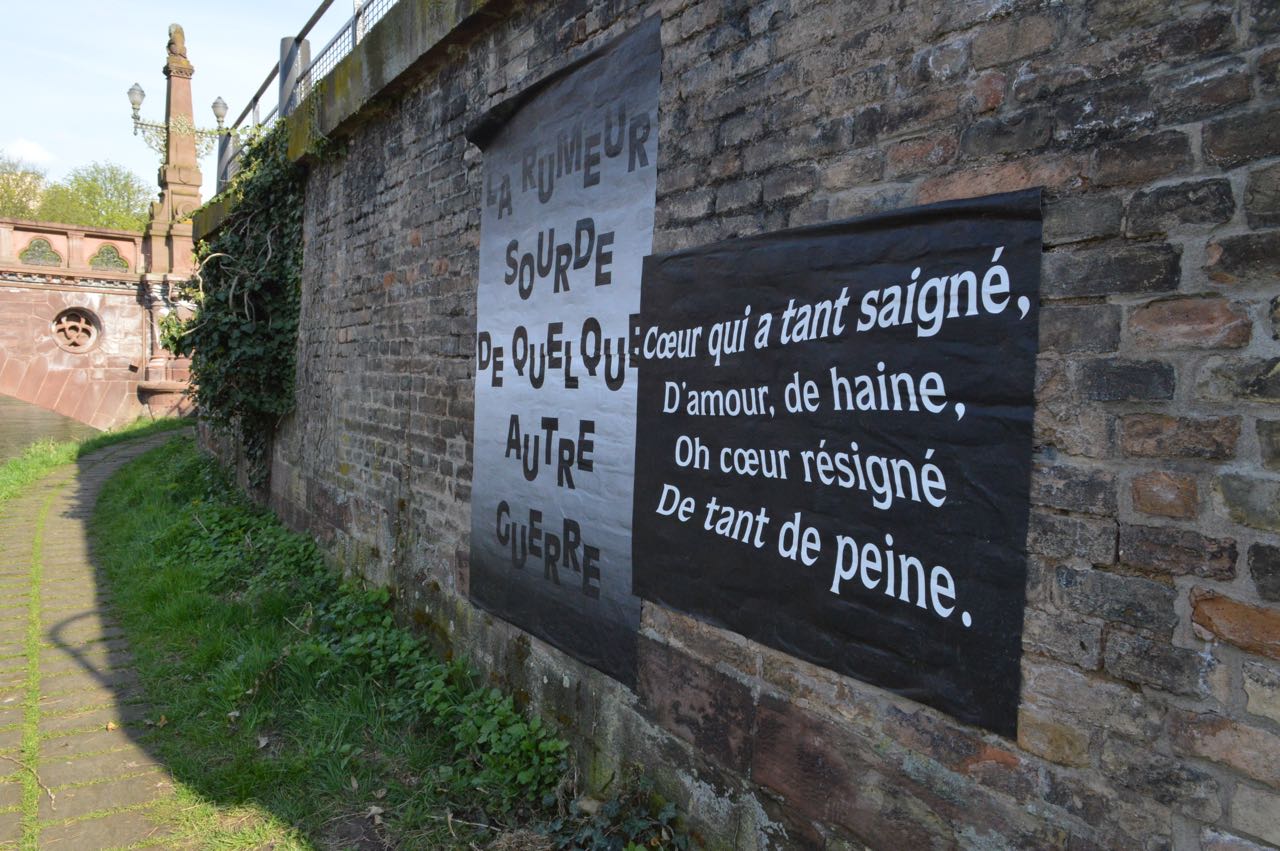 Cent ans après le début de la Grande Guerre, donner à voir les vers de Péguy, Stadler et Owen dans un autre contexte de lecture permettant de réactualiser leur force poétique. Le texte intégral de ces poèmes est ainsi mis en scène le long des deux quais de l’Ill, du tribunal aux Halles.