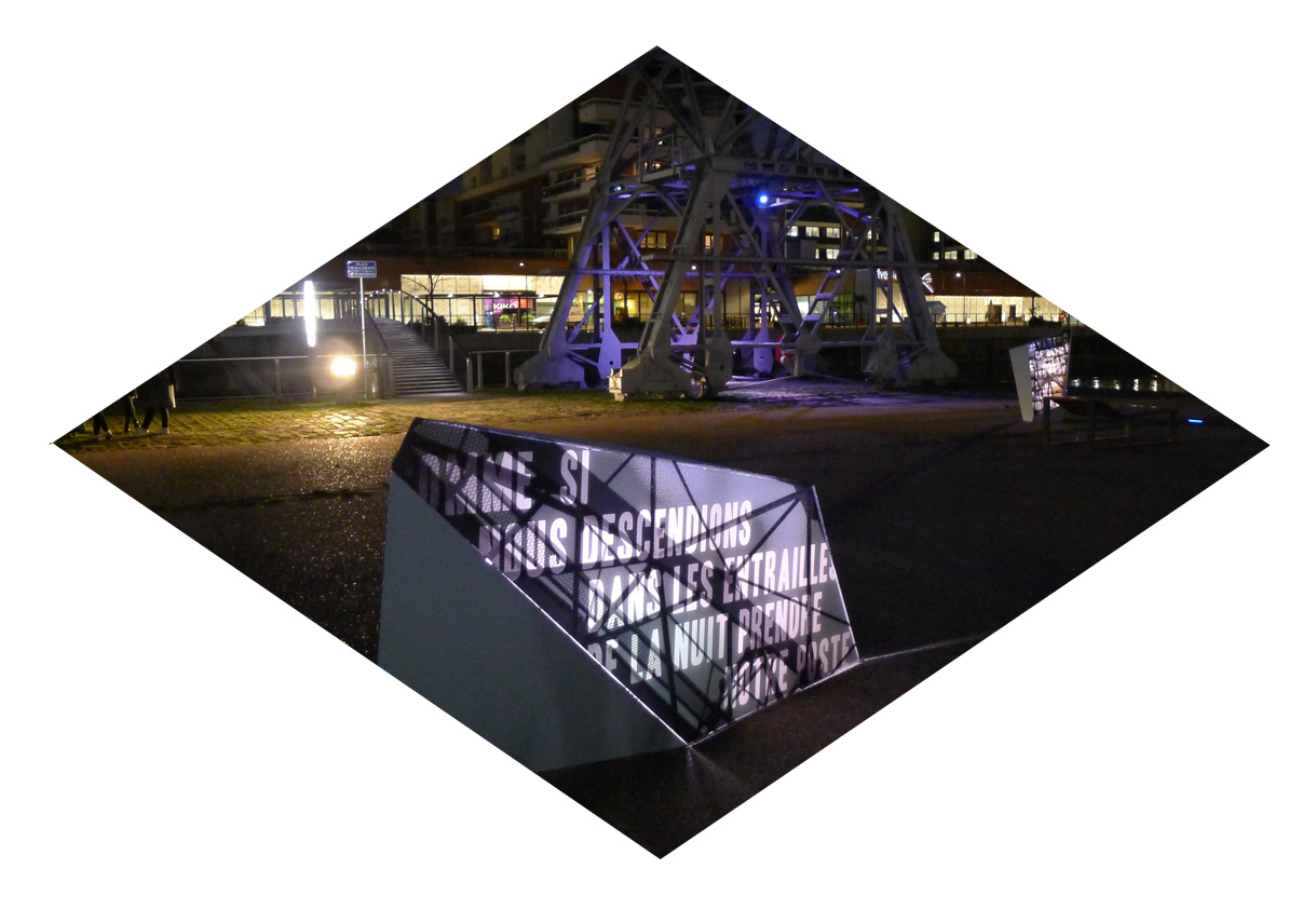Cent ans après le début de la Grande Guerre, donner à voir les vers de Péguy, Stadler et Owen dans un autre contexte de lecture permettant de réactualiser leur force poétique. Le texte intégral de ces poèmes est ainsi mis en scène le long des deux quais de l’Ill, du tribunal aux Halles.